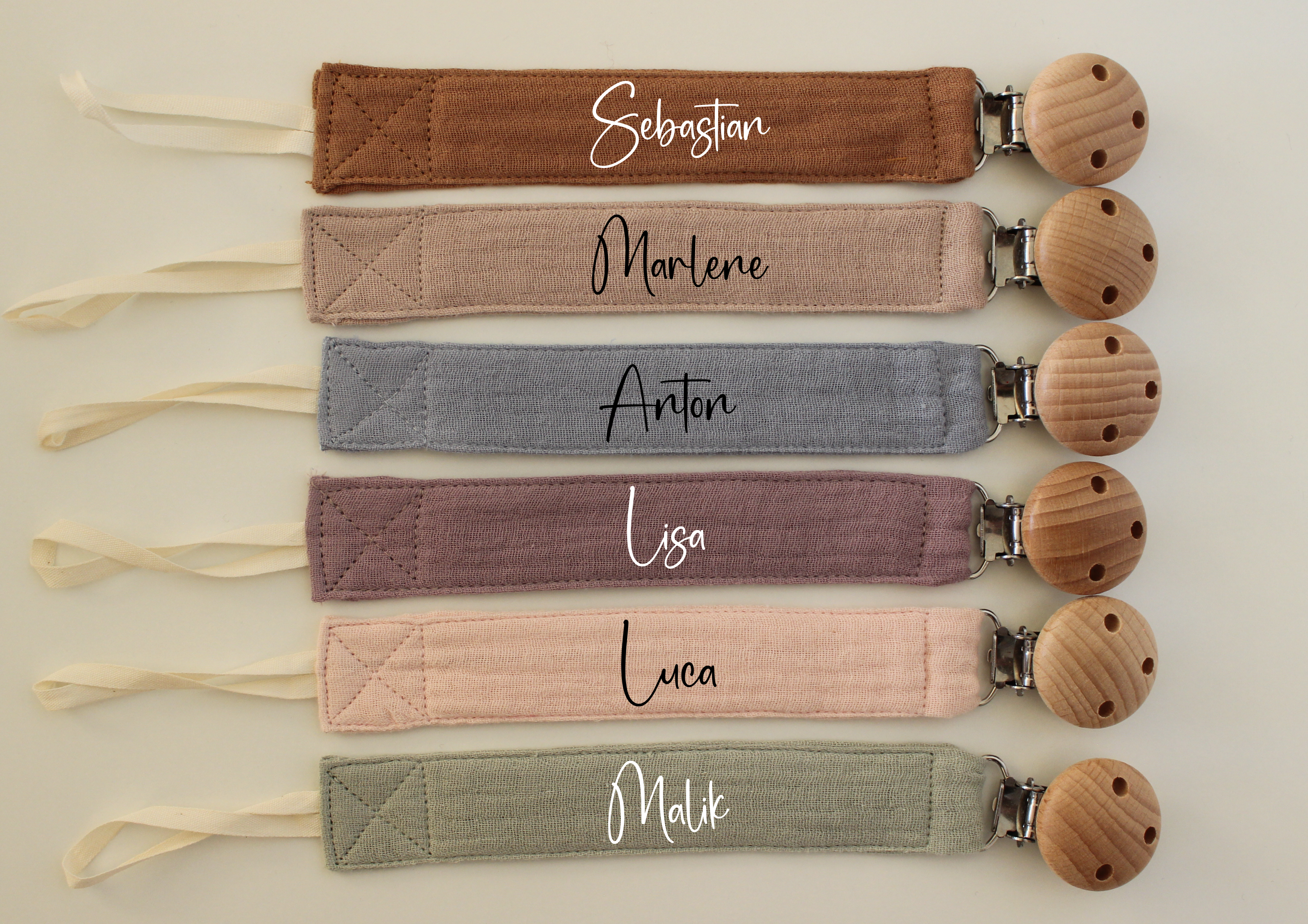 Deine Schnullerkette mit dem Namen deines Babys – in zarten Farben, aus schadstoffgeprüftem Musselin.